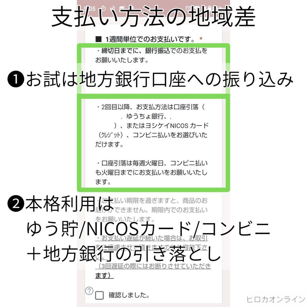 支払方法は、全国共通は「郵貯引き落とし(振替)」と「ヨシケイNICOSカード(クレカ払い)」。地域によって、地方銀行や各種クレジットカードへの対応状況は違うとのこと。
