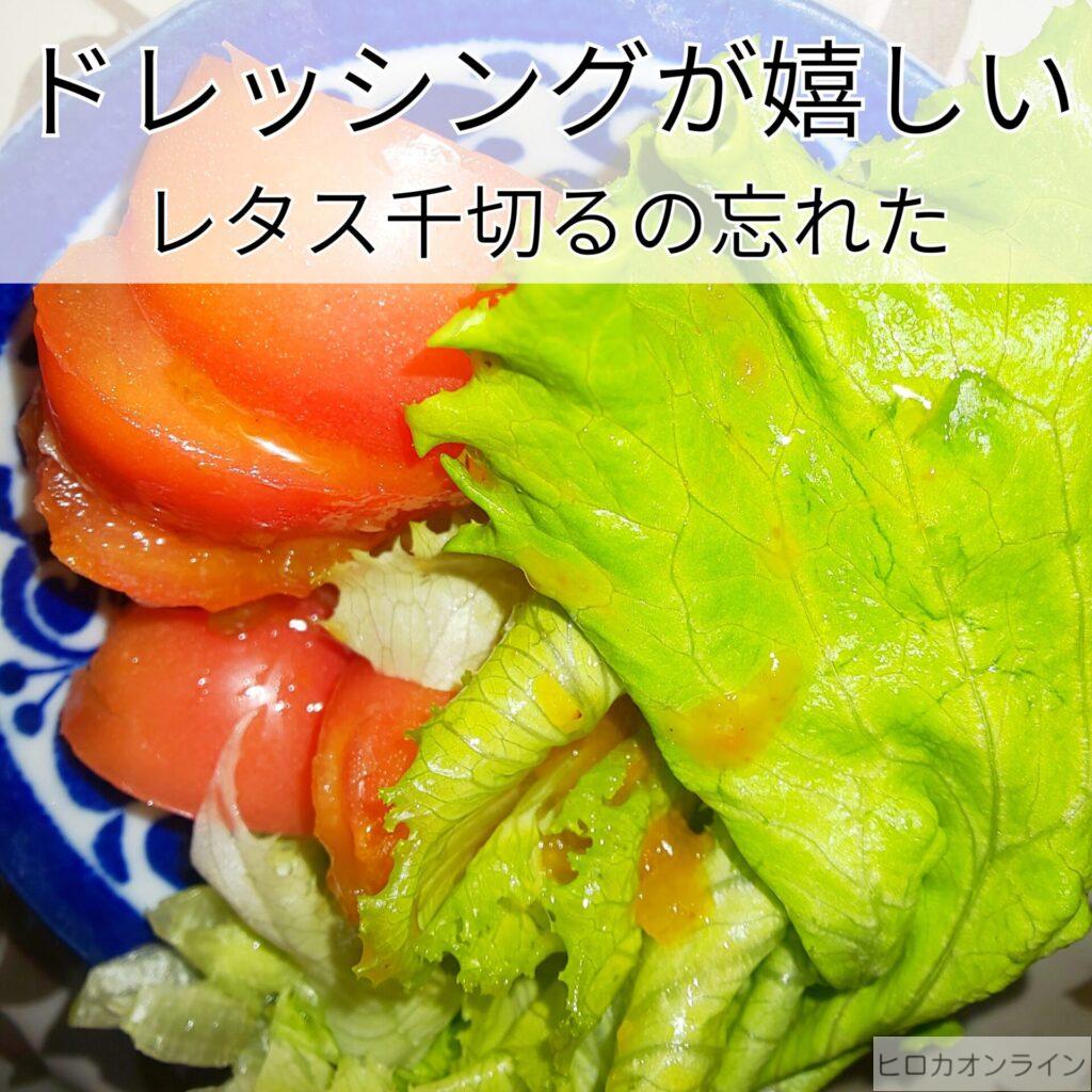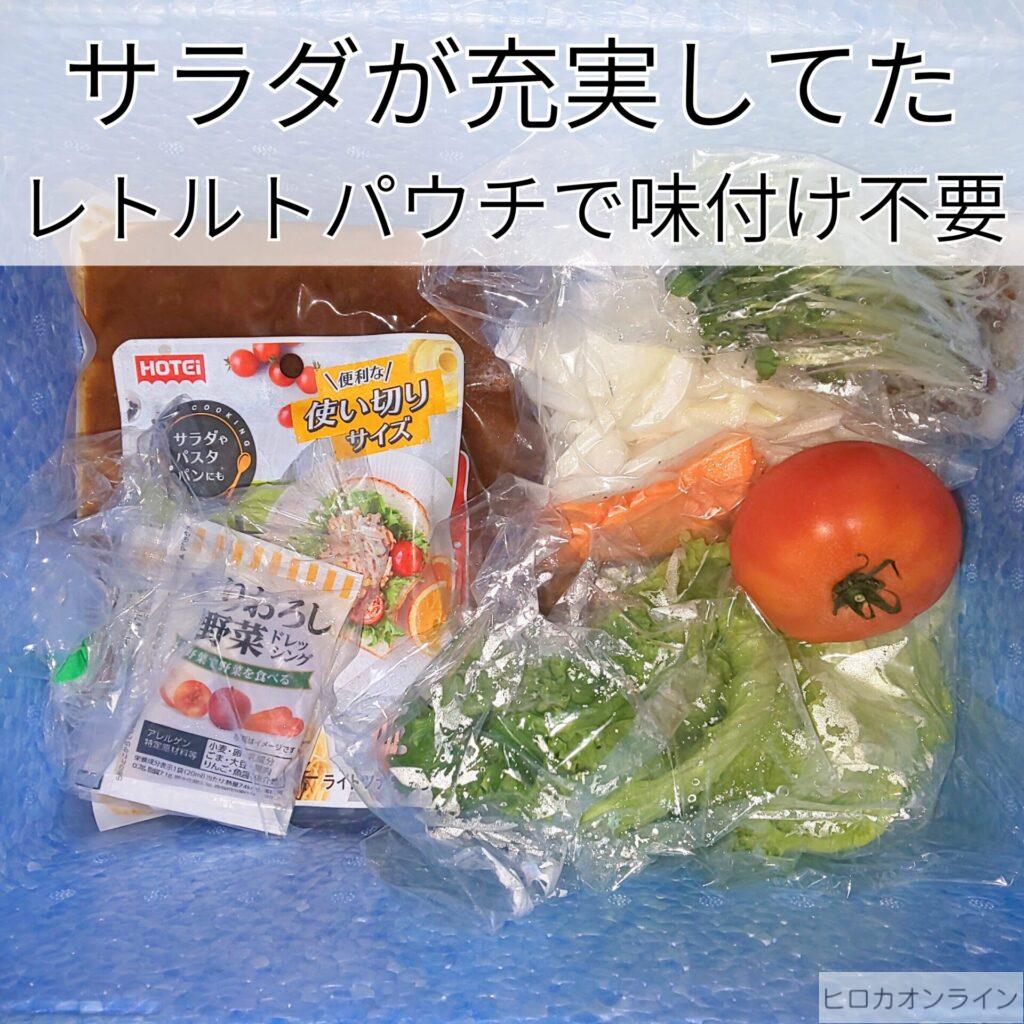 思いのほかサラダが豪華でした。トマトが丸々1玉だし、ツナやドレッシングまでついてたので。以前「カットミール」の時は、ミニトマト/ツナなし/ドレッシングなしでした。