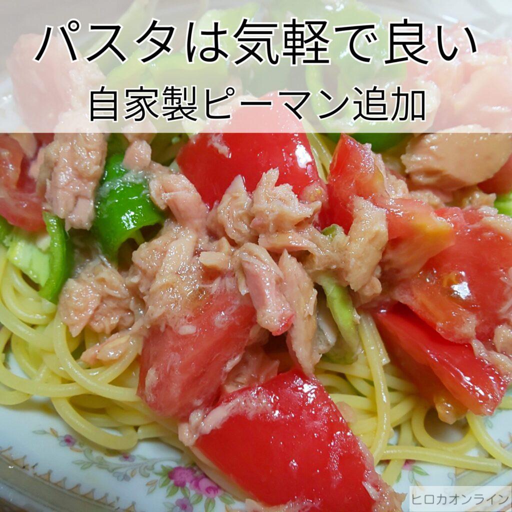 使った食材は、パスタは2/3, ゆずポン酢1/2, トマト全1個, ツナ全1袋, 自家製ピーマン。余ったパスタとゆずポン酢は、別の料理で使おうと思います
