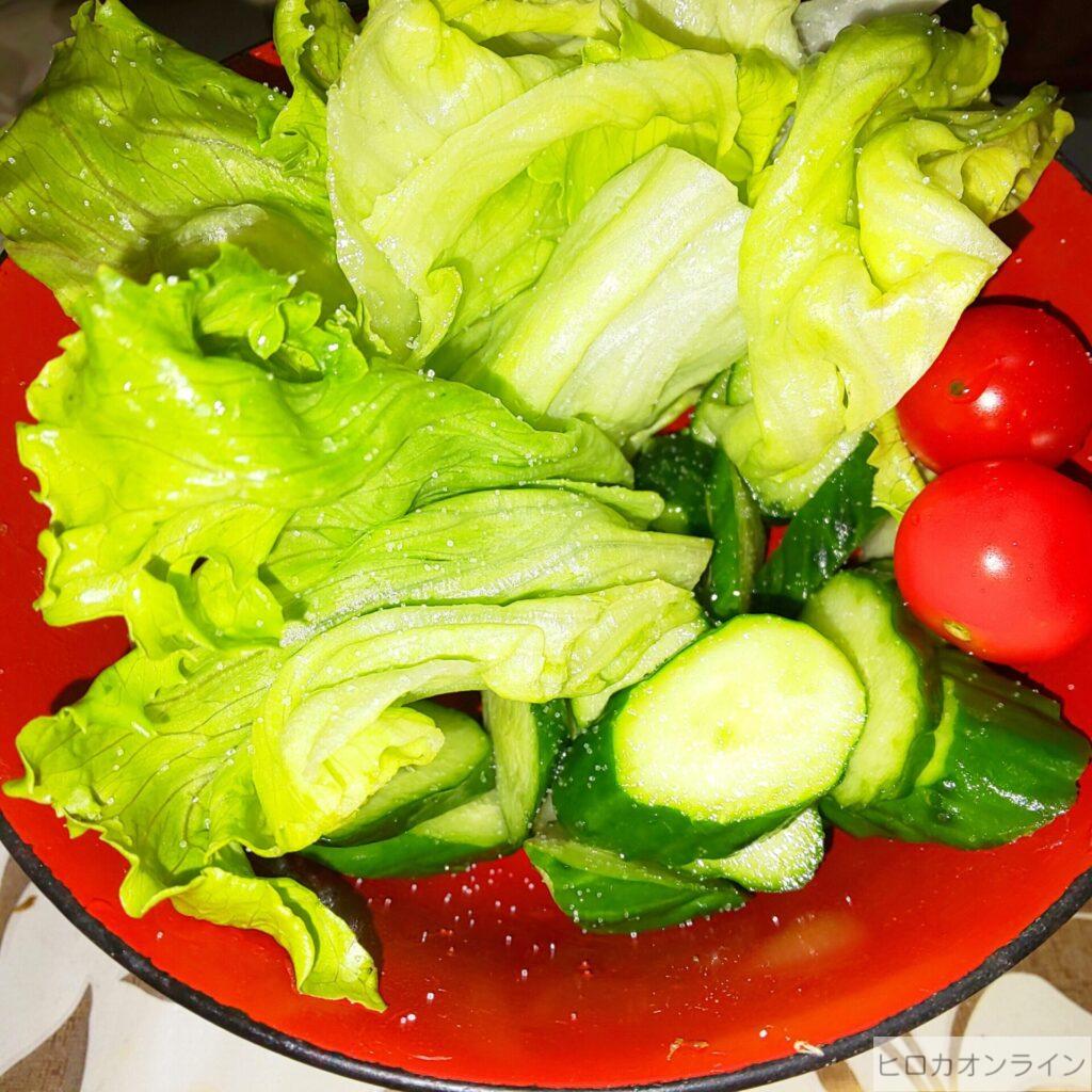 サラダには、お塩をかけました。野菜は一応水でサッと洗って、レタスは手でちぎり、キュウリは包丁、ミニトマトは下手を取っただけ。
