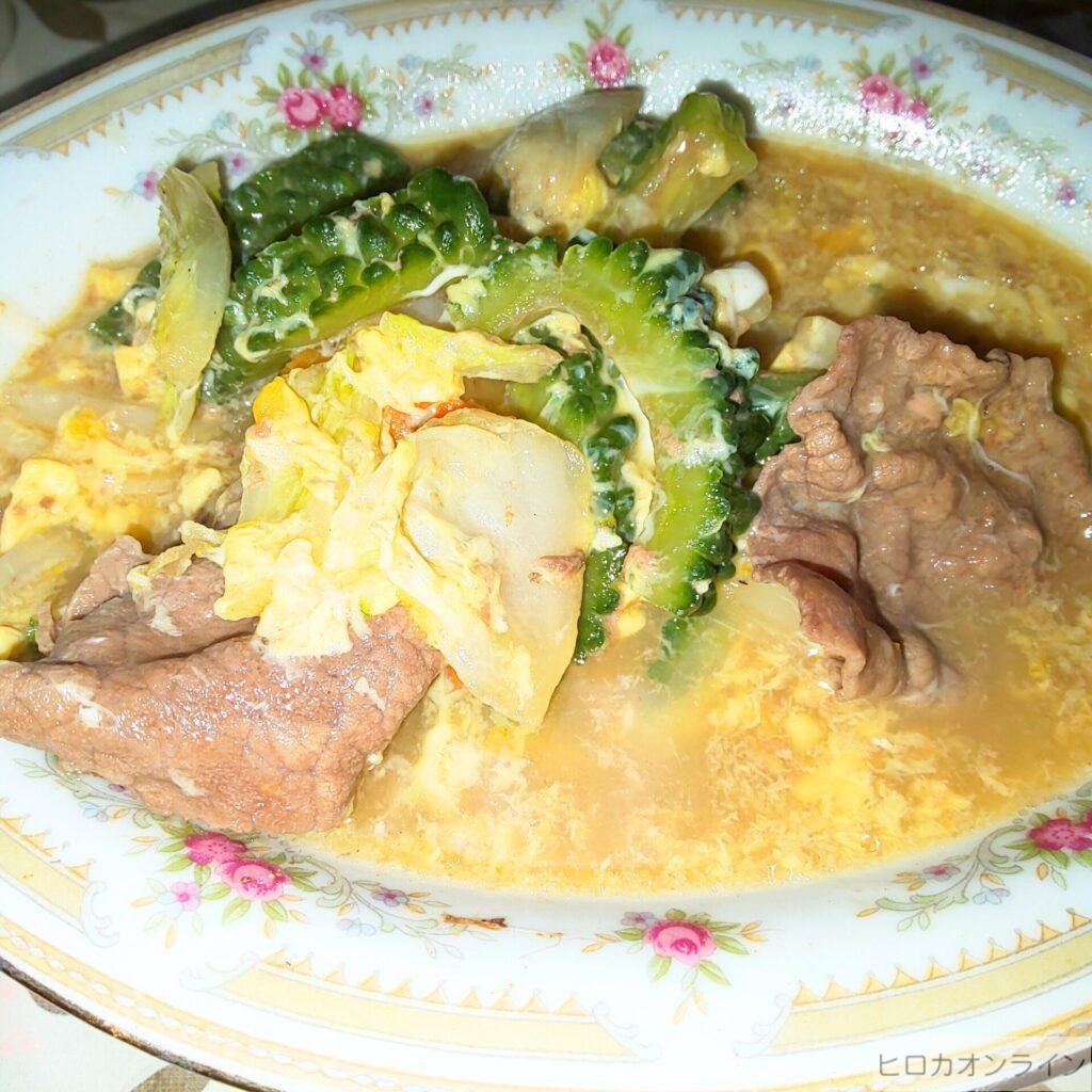 中華スープのカット野菜にゴーヤを足して、「すき焼き風煮」の第二弾にしました。お肉は3日目の「すき焼き風煮」の牛肉。