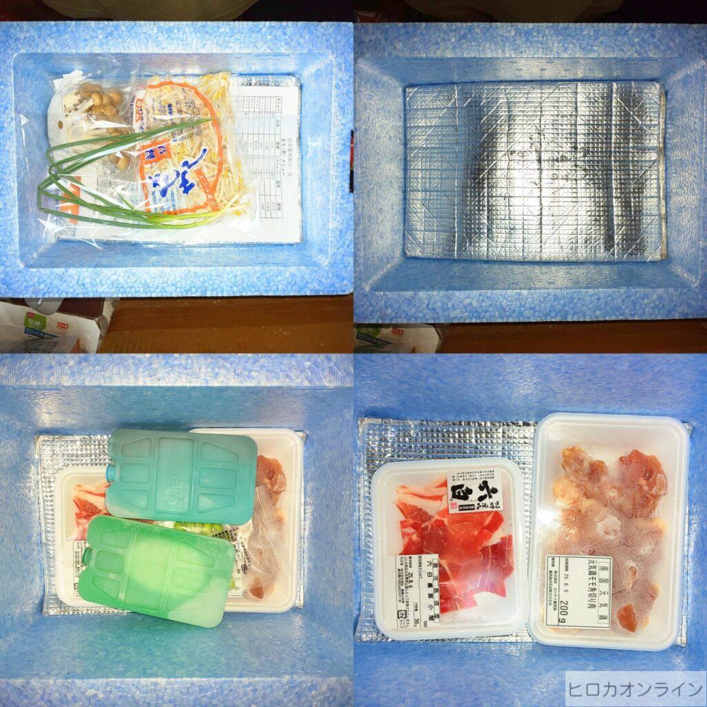 一番上に野菜、銀シート、二層目に肉(冷凍)と保冷剤、最下層に銀シート。