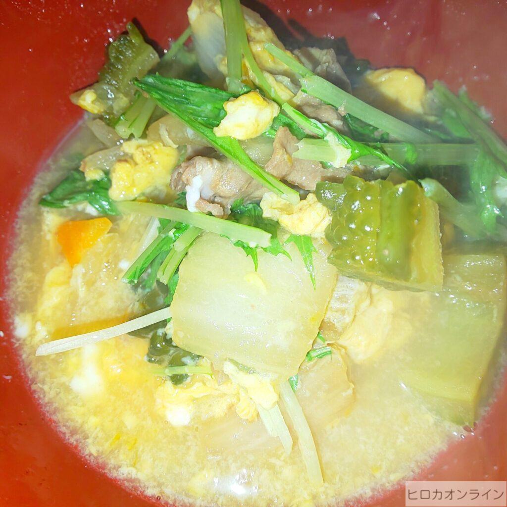 中華スープのカット野菜にゴーヤを足して、「すき焼き風煮」の第二弾にしました。お肉は3日目の「すき焼き風煮」の牛肉。
